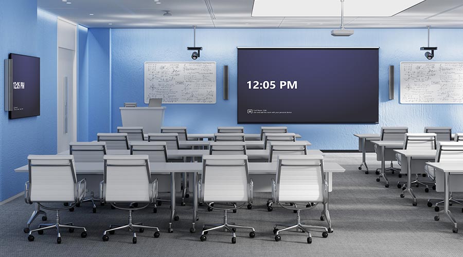 Large room audio-video systems with sophisticated devices like multiple cameras, ceiling microphones, speakers, and other devices for various meeting platforms are available. Deploy smart technology audio-video systems in large rooms for business-client meetings, investor meetings, or any extensive meet-up that requires better picture clarity, smooth audio delivery, and easy management.